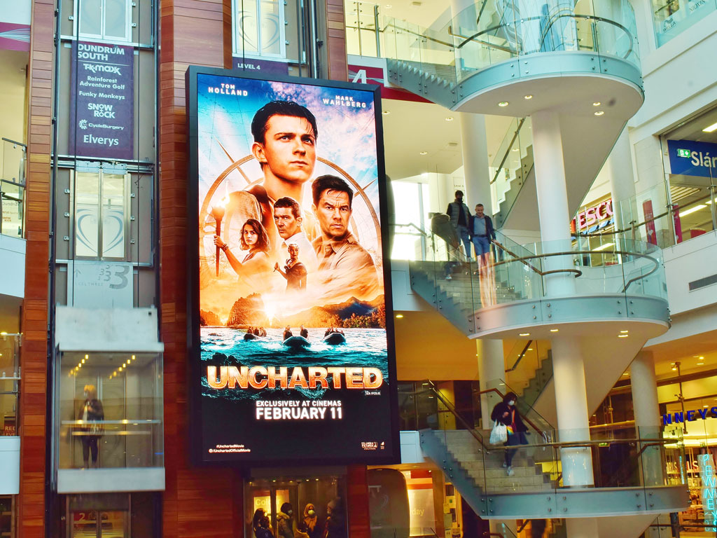 This month, Sony Pictures new Film Uncharted is taking full of advantage of Out of Home’s key strengths. In the build up to the release, the campaign is running across formats such as DX Screen in Dundrum shopping centre, Adshel Live and Digipoles. The Film took to the Aviva Screens during Ireland’s opening game for The Guinness Six Nations. By targeting events, the film reached a large audience of 52,000 spectators and highlights how the broad reach of OOH is unparalleled. Uncharted is out now exclusively in cinemas nationwide.
