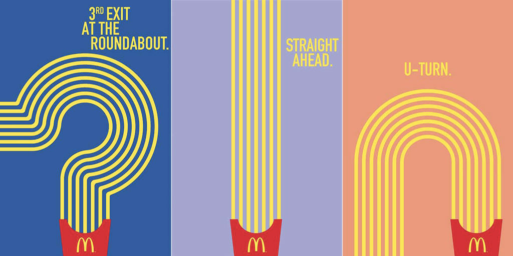 McDonald’s used its fries to guide patrons to the nearest location in these fun artistic minimalism ads by TBWA\Paris. Directional signage need not be boring.