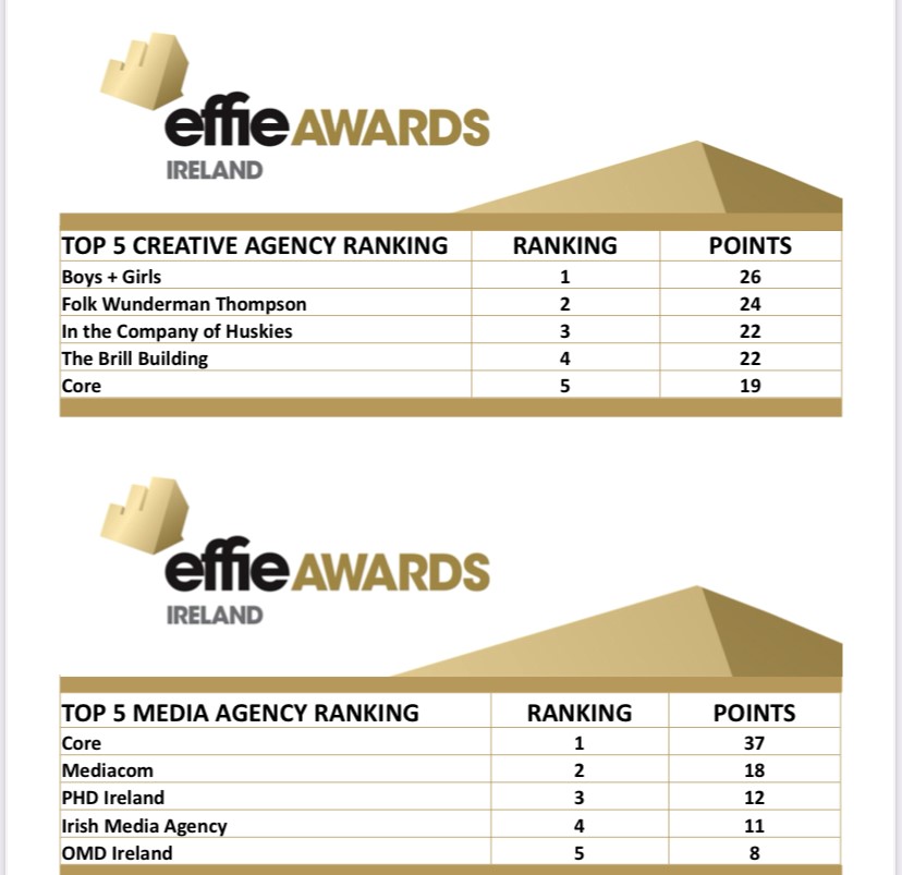 “We’re delighted to top the inaugural Effie Index in Ireland and are grateful to IAPI for bringing Effies to Ireland. Effectiveness is central to our culture in Core. It is the reason why successful brands advertise”, says Andy Pierce.