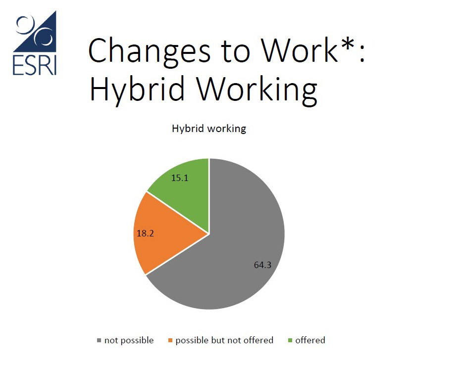 For over four fifths of workers hybrid working is either not possible or not offered. For nearly two-thirds of works hybrid working is not possible while almost one-in-five workers report that their job could be done from home, but this flexibility is not offered. For workers for whom hybrid working is feasible, the majority are happy with the number of days they attend their place of work.