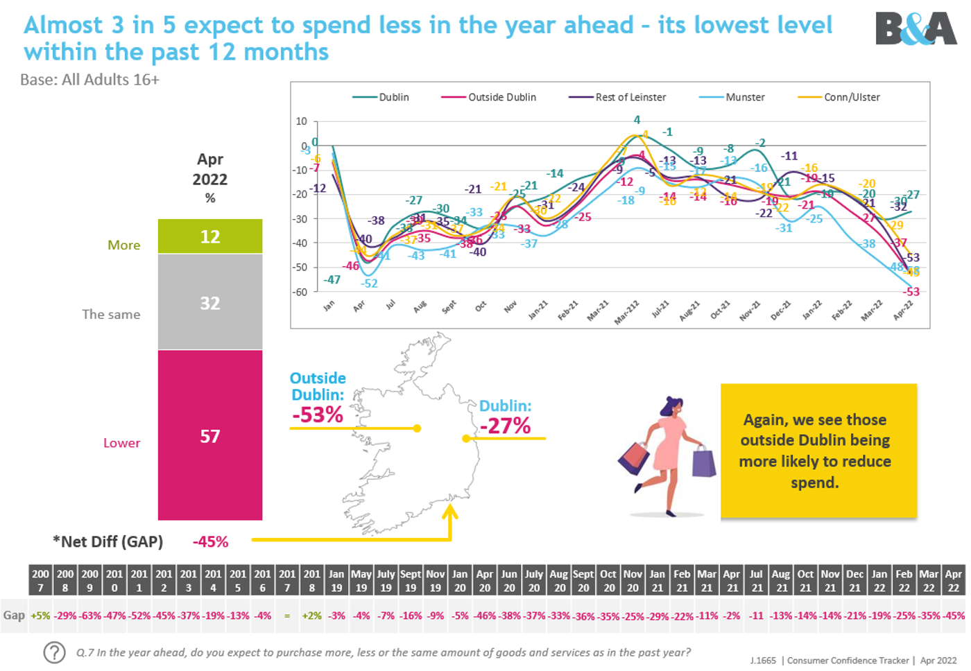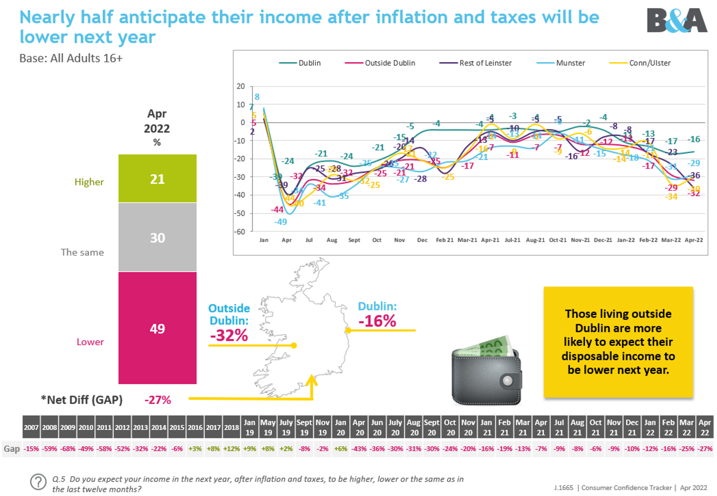 Almost half expect their disposable income to be lower next year – this is especially the case outside Dublin. Just 1 in 5 expect their disposable income to be higher in the coming year.