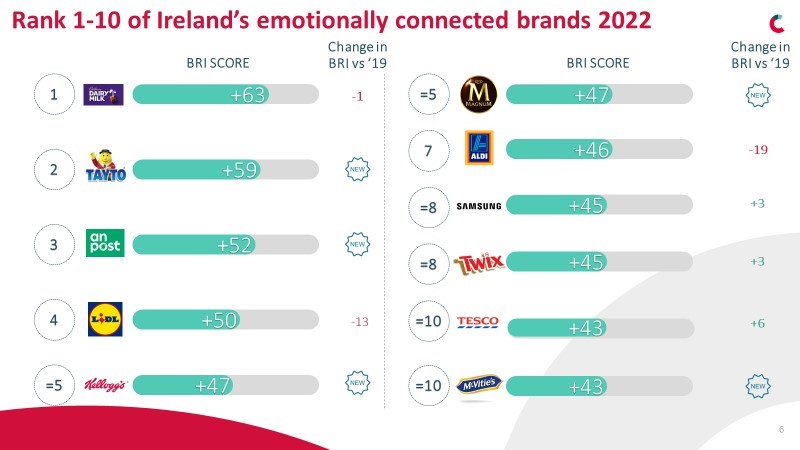 This year we also added in a number of new brands, increasing our total number of brands tested from 100 to 137. We can now see the emotional strength that some of the new FMCG brands have with consumers, with 6 FMCG brands featuring in the top 10. But it is not just FMCG that moves into the top 10, we also added in An Post this year, and it went straight to the top, taking 3rd place and placing itself firmly as the leading service brand in Ireland in terms of emotional connections.