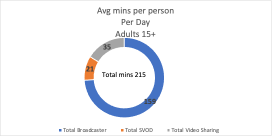 According to the TAM figures, Adults aged 24-44yrs view broadcaster content for 102 mins per day compared to 30 mins from the SVOD services and 38 mins from video sharing platforms. In addition, the younger 15-34yr old cohort spends twice as much time with broadcaster content than SVOD at 65 mins and 32 mins per day respectively.