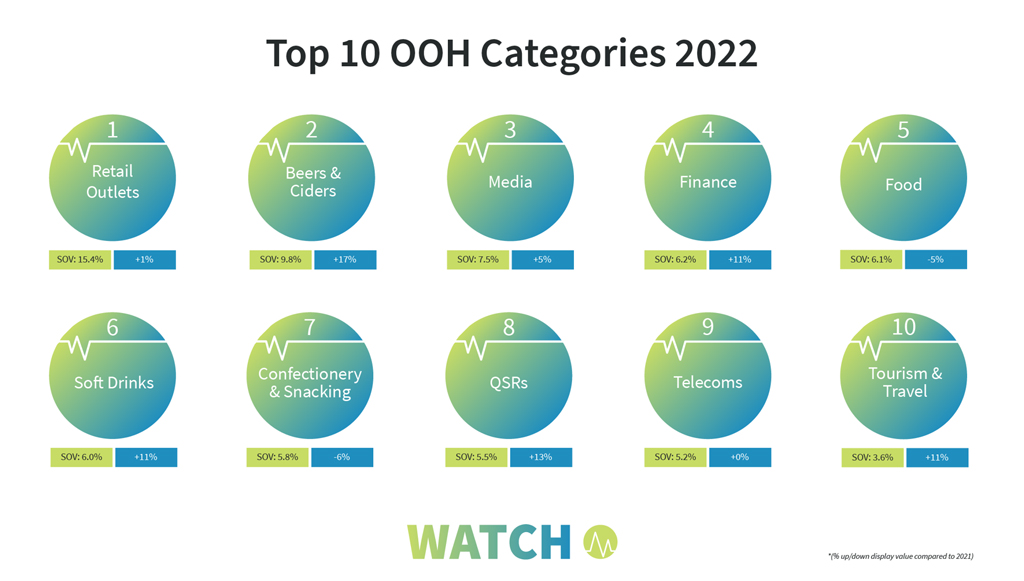 On average, both the top ten categories and top 10 advertisers increased their OOH display value by 6% in 2022 compared to 2021. This reflects a year of growth for the medium following a turbulent couple of years for Outdoor.