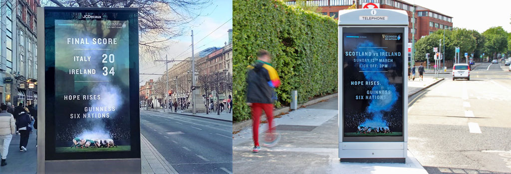 Throughout the tournament title sponsor Guinness is utilising Dynamic OOH to build anticipation and awareness by displaying Ireland’s fixtures and final scores on screens across the capital.