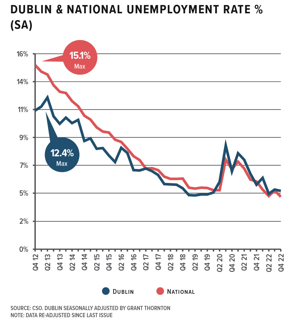 Employment rates in the Dublin economy continued to rise across Q4 2022 as job creation increased across a number of sectors. Close to 800,000 Dubliners were in employment in Q4 – an increase of 1.1% YoY. The main drivers were in industry and construction with increases of 5.6% and 20.9% YoY respectively.