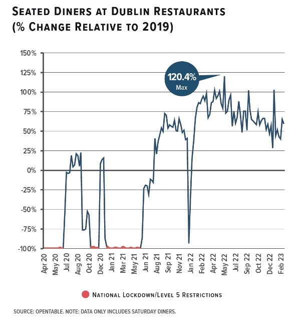 Throughout February 2023 the Dublin hospitality sector remained buoyant in even amid growing cost-of-living pressures. The volume of seated customers across restaurants in Dublin was almost 60% above the 2019 baseline for the month, following a strong performance across Q4 bolstered by the Christmas period.