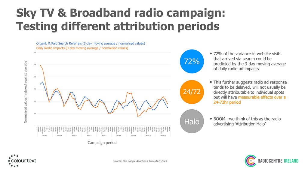 The research was unveiled this week and focused on analytics data for a Sky TV and Broadband campaign that was active in Q1 2023. The research shows that a very short-term response measurement (within 15 minutes) did not pick up on the full strength of radio’s ability to drive responses. However, the true effect of radio only becomes apparent when the analysis zoomed out to a broader 24-hour period
