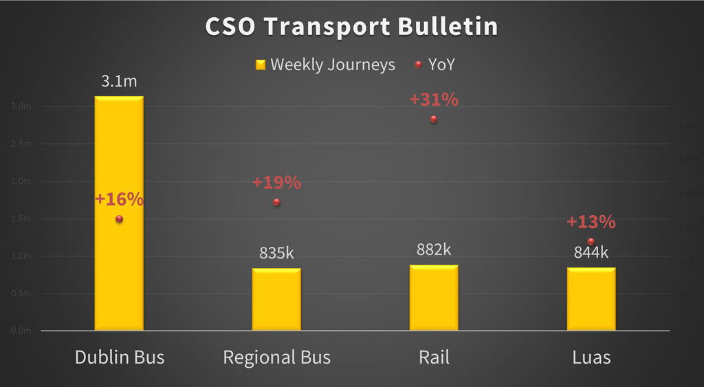 The CSO’s latest Transport Bulletin shows significant increases in public transport journeys taken during week 35 beginning 28th August.