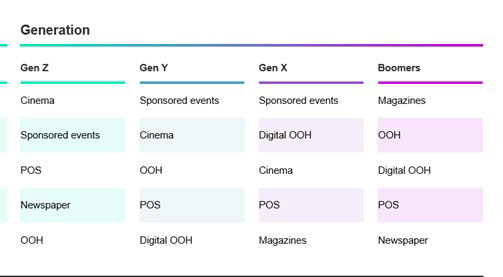 In terms of generations, either Classic or Digital OOH appear in the top five media of the four primary age groupings.