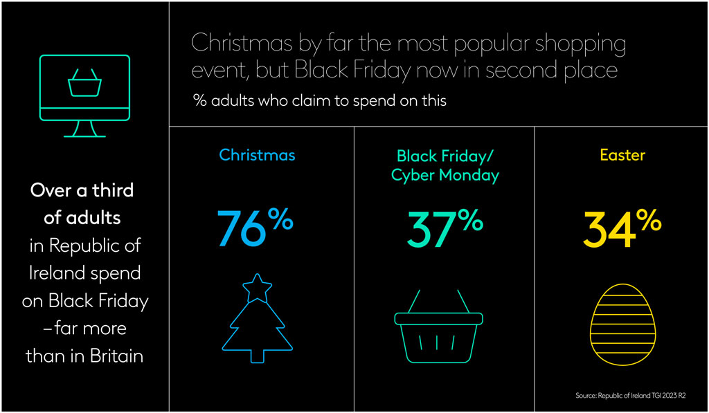 Recent data from Kantar shows Black Friday consumers in the Republic Ireland spend on more than both the UK and NI. 37% of adults claim to have made a purchase on the most recent Black Friday Weekend. The proportion of adults is also far higher than the those who have bought anything around Easter or Halloween – but lower than the proportion who spend on Christmas.