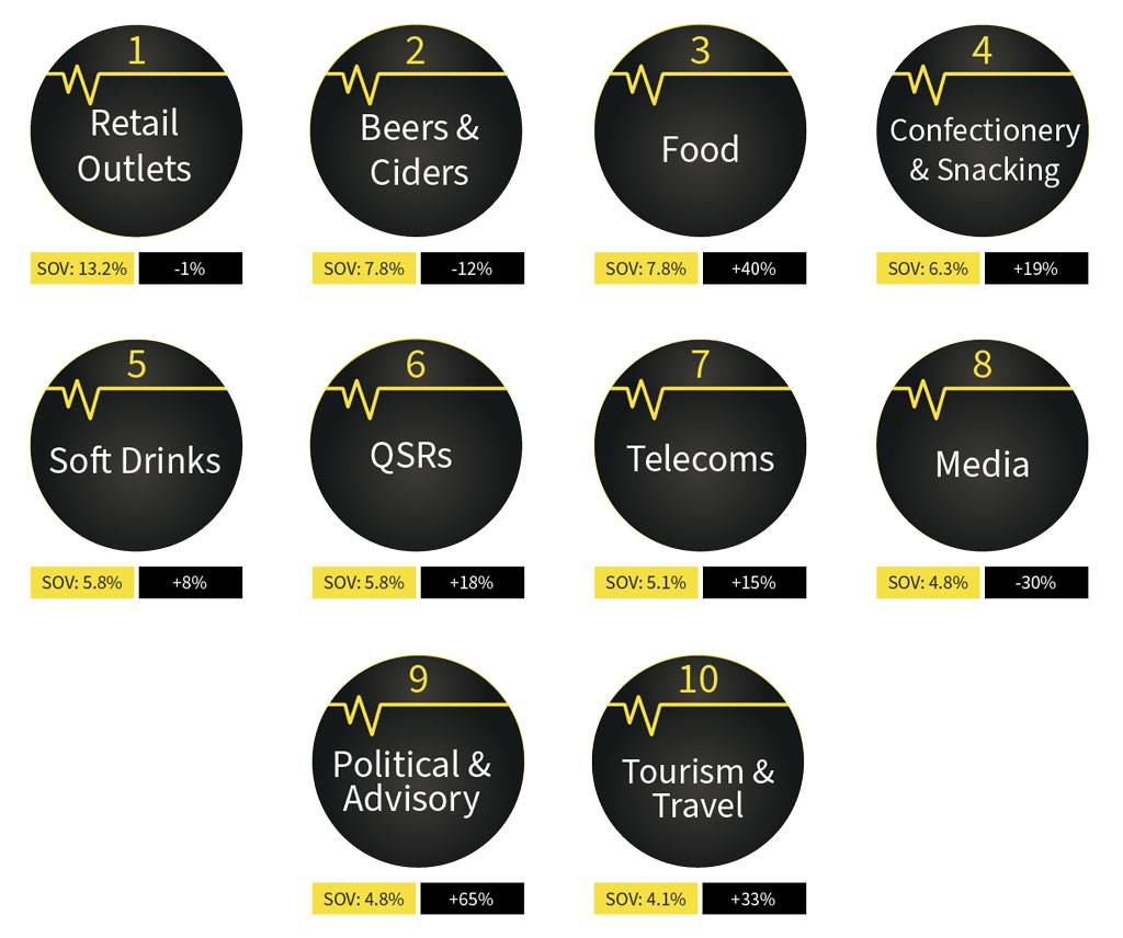 Growth in other areas of consumer packaged goods is witnessed in confectionery and snacking (+19%) and soft drinks (+8%). Retail outlets maintain its position as the #1 market with a 13% share of voice.