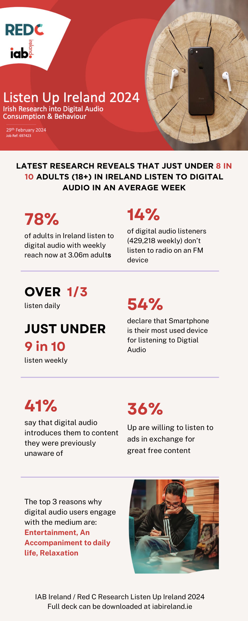 Digital audio consumption in Ireland has continued to grow with 78% of Irish adults now consuming some form of digital audio, according to IAB Ireland’s “Listen Up” report which was carried out by RED C Research.