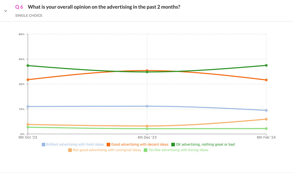 After a brief boost during Christmas period when the festive nature of many of the ads provided a seasonal lift, the perception of the quality of advertising in Ireland has worsened since then, with the majority of people deeming it to be just “ok”, “nothing great” or “bad”.