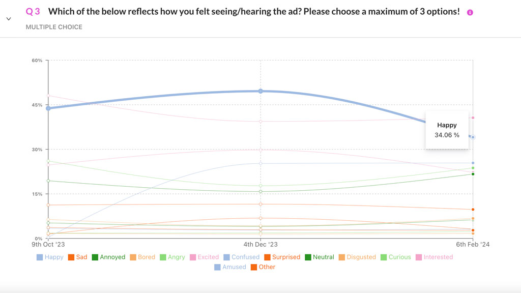 The emotions people selected to describe how they felt in relation to the ads they remembered were notably more muted when compared with previous editions – with ‘happy’, in particular, dropping significantly and ‘neutral’ increasing vs previous waves.
