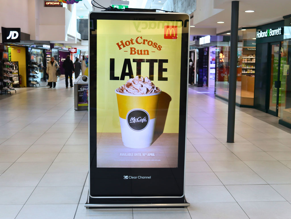The bow-wrapped gold bunny has long been a signature shelf occupant throughout the Easter period and beyond. This Easter, Lindt brought its iconic confection to Outdoor once again, advertising on Mall Digital formats throughout cycle 7. Planned by Starcom and Source out of home, the creative taps into the joy of chocolate giving with the tagline ‘make your Easter sparkle’. McDonald’s Latte