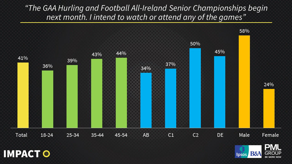 Breaking out the demographic data is more revealing. 35–54-year-olds push above the total % at 43% and 44% indicating their intention to watch or attend, while male responses peak out with 58% ready to immerse in the action.