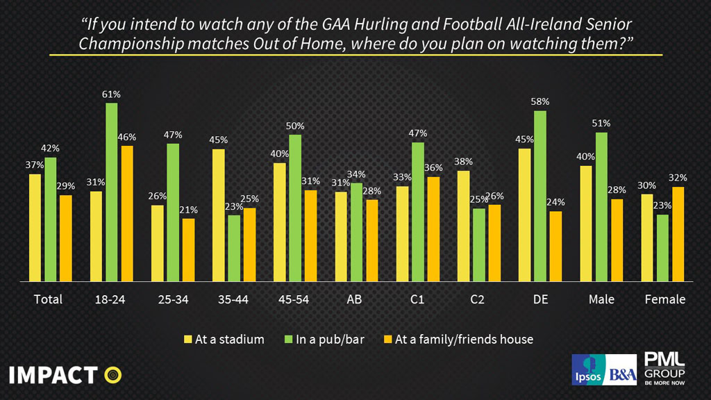 A similar story is told amongst 25-34s and 45-54s, with 47% and 50% noting the same respectively. Many intend to venture out of the home to another family or friends house to view in a social setting at 37%, peaking at 45% of 35–44-year-olds. The male category again comes out ahead with 40% and 28% noting to view live at a stadium and at a family/friend’s house. Only 1% marked their intention to avoid viewing matches, peaking at 4% of 18-24s.