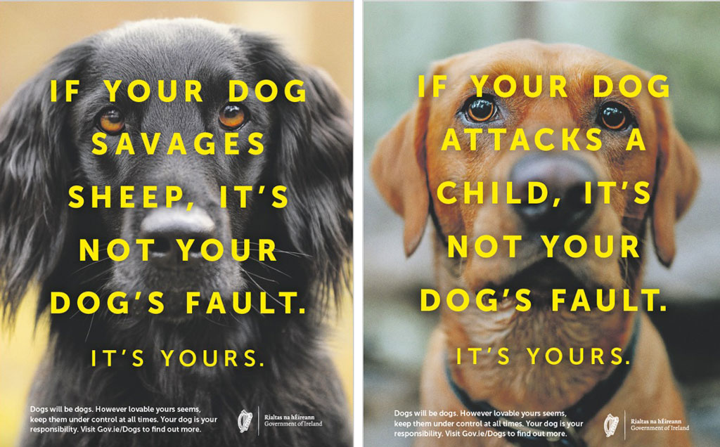 Centred around the fact that even the most seemingly lovable dogs can attack – both humans and livestock, the campaign entitled ‘It’s not your dogs fault, it’s yours’ urges dog owners to recognise this and control their dogs. Addressing dog owners directly, it states “Your dog is your responsibility”.