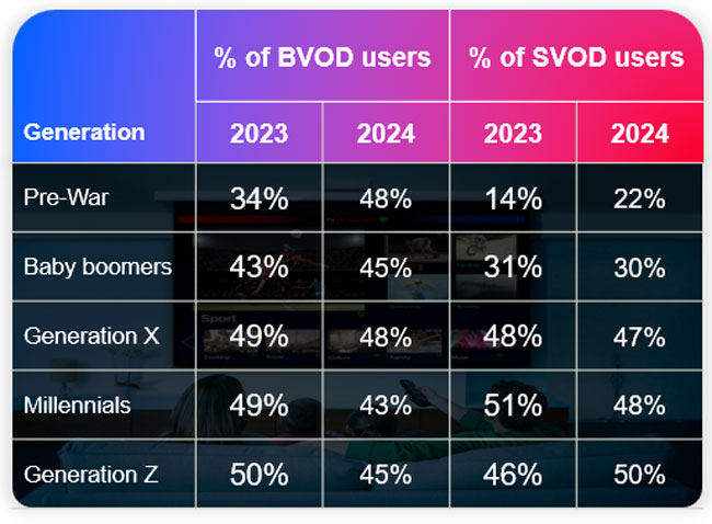 The TGI figures also show that there has been a large increase in the number of BVOD and SVOD users among the pre-war adults (see table)
