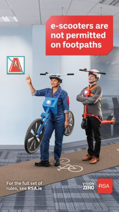 “The new e-scooters legislation is an important change on Irish roads. We are asking people on e-scooters and other road users to familiarise themselves with the new traffic laws and regulations so that we can all understand how to share the roads safely together,” says Sarah O’Connor, director of partnerships & external affairs with the Road Safety Authority.