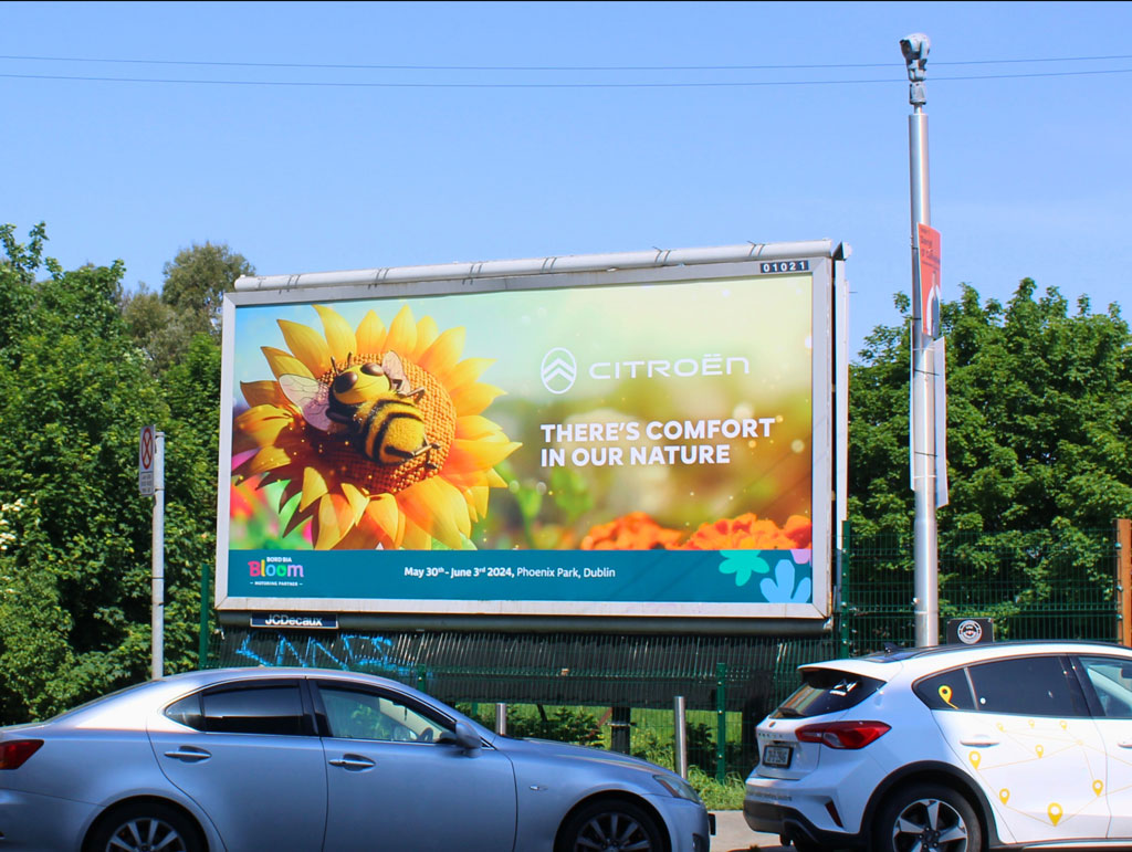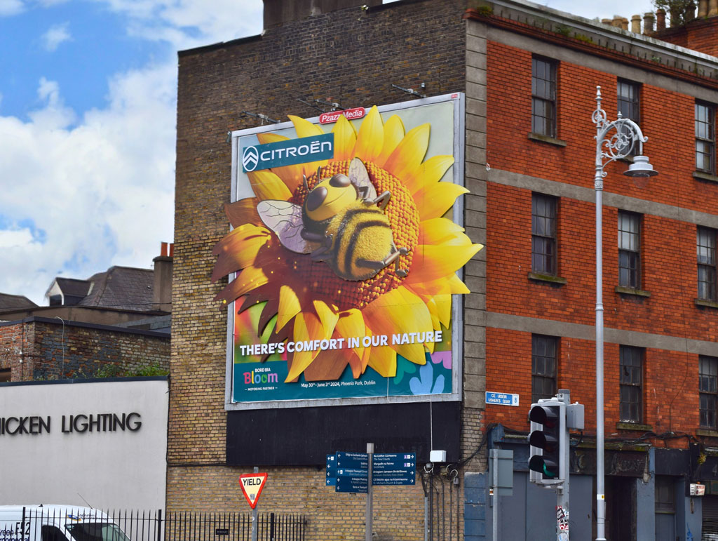 “Our OOH special on Usher’s Island was again expertly brought to life by the team at PML”, says Trevor Hunt, Citroën Head of Marketing, “Highly impactful, colourful creative was combined with the copy line ‘There’s comfort in our nature’, reflecting both the Citroën brand focus on comfort. We look forward to another successful Bord Bia Bloom this June bank holiday weekend”.