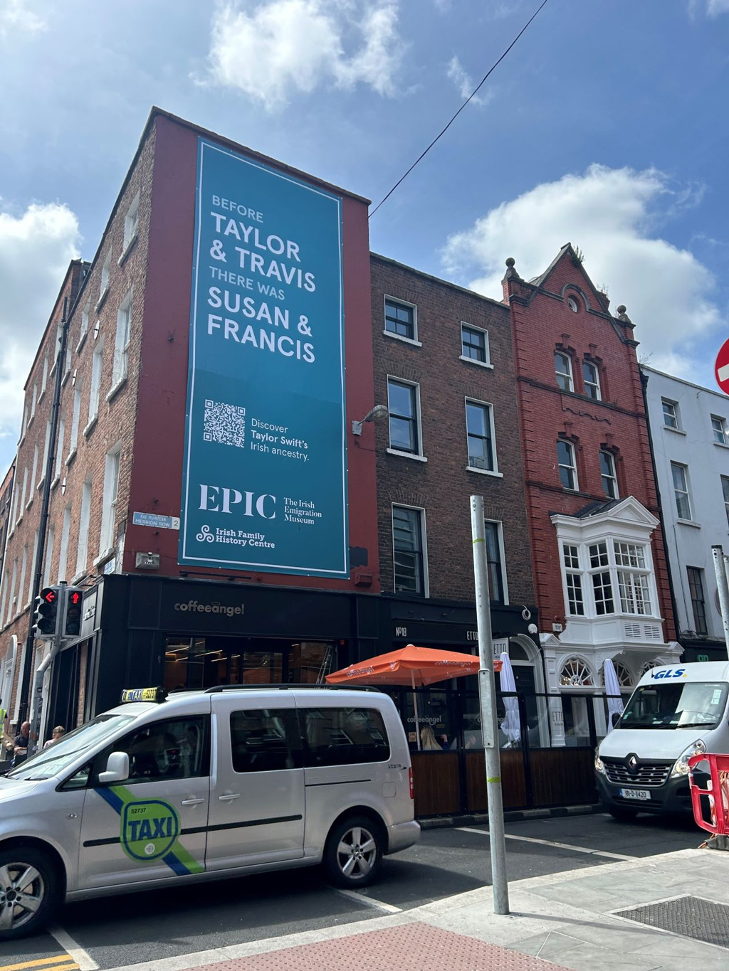 Most attention-grabbing is EPIC The Irish Emigration Museum’s latest campaign, running across Digivans and Banners. This OOH initiative, part of a broader strategy, highlights Taylor Swift’s Irish heritage. Planned by PML and Digital Impact Marketing, the campaign has garnered significant mainstream attention over the past week by revealing details of Swift’s ancestry, linking her to Castleisland, Co. Kerry. The campaign explores the emigration stories of her ancestors who left Ireland during the 19th century, adding a unique dimension to Swift’s Dublin performances. These advertisements will be displayed in proximity to the Aviva Stadium throughout the weekend.