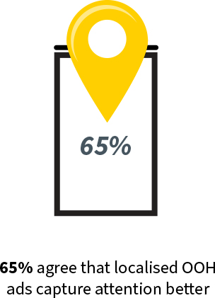 Localized OOH ads capture attention more effectively, with 65% of respondents noting better attention capture for contextual messages. These ads also make consumers more likely to notice future advertisements from the brand. The study found that 60% of respondents were more likely to notice future ads from brands using contextual messaging.