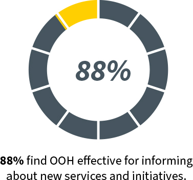 OOH is effective in disseminating public information, with 88% of respondents acknowledging its efficacy in informing about new services and initiatives. The medium’s wide reach and high frequency make it ideal for public awareness campaigns.