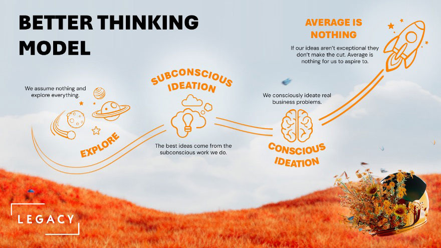 Everything about a process when it comes to creativity seems counter intuitive, but ideas need parameters. A simple but meticulously thought-out four stage process has been developed at Legacy to enable everyone to think better.