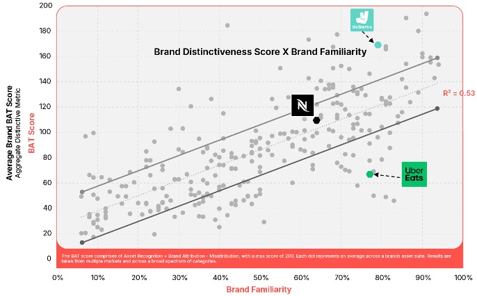 This graph plots a brand’s average BAT score, an aggregate of three key distinctiveness metrics, and brand familiarity, a proxy for brand size.