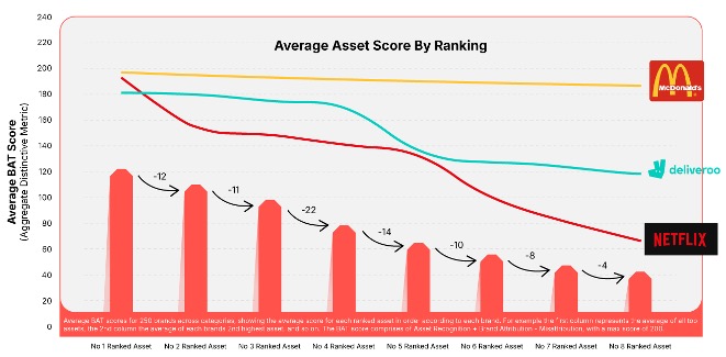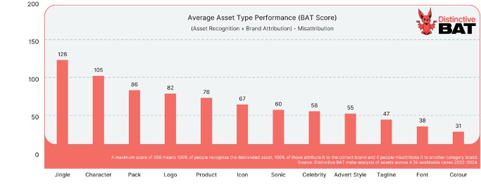 This graph shows the average BAT score, an aggregate of three key distinctiveness metrics, across different types of assets. Data taken from a large range of categories and markets.