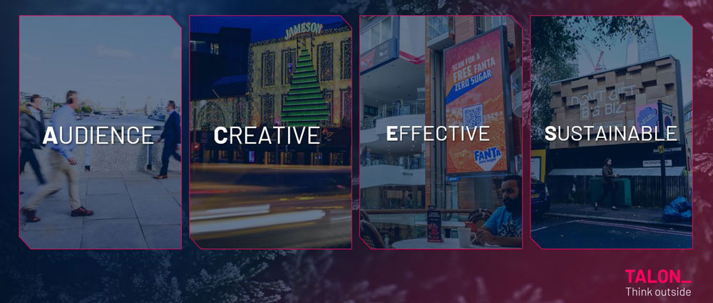 The Q4 outlook this year for OOH is looking “Merry & Bright”. At Talon we believe that OOH delivers across four main benefits: understanding your Audience, crafting Creative that captivates attention, ensuring Effectiveness to drive real results, and embracing Sustainability for a responsible impact – otherwise known as ACES.