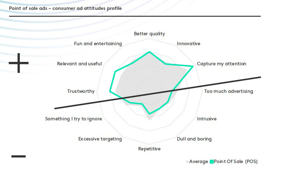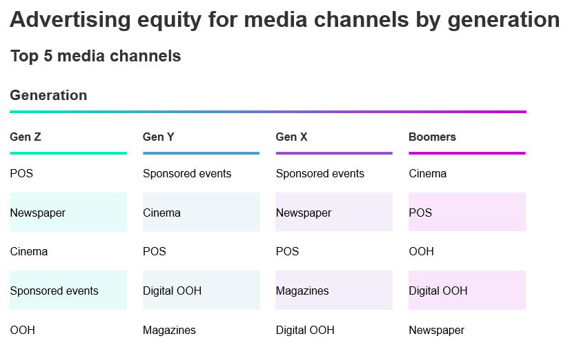 In terms of generations, Point of Sale ads appear in the top five media of the four primary age groupings. Out of Home is also very much in favour across the board being popular with both Gen Z and Bomers while Millennials (Gen Y) and Gen X rank DOOH highly. The results table confirms that when it comes to advertising, consumers prefer in-person media channels that cause the least interruption to their lives.
