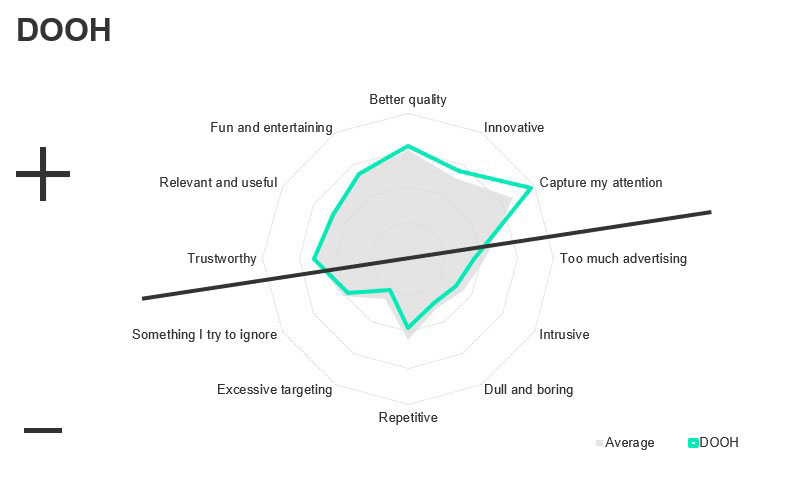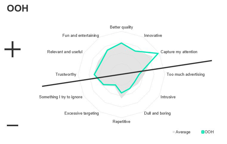 So we know that consumers prefer sociable over social media. But the question is why? Both Classic and Digital Out of Home index highly for positive traits particularly in terms of attention and trust while on the other hand not being negatively perceived as either repetitive or boring. Digital OOH is perceived as one of the most innovative channels out there.
