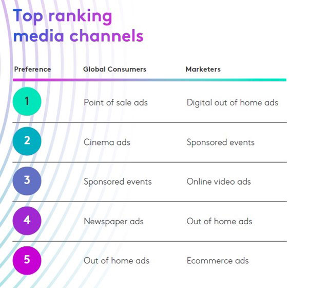 Breaking down preferences by media channel, Digital OOH (DOOH) topped the ranking for marketers, followed by sponsored events, online video, Classic OOH and ecommerce.