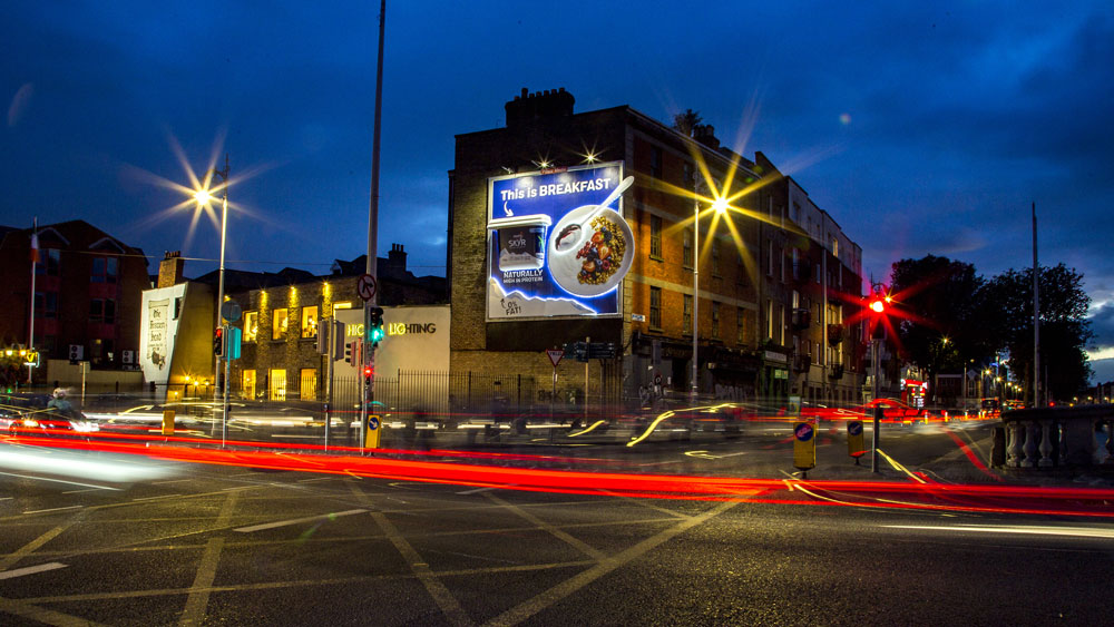 The installation produced by Eclipse Media, features a striking, halo-lit 2D giant bowl of muesli that extends beyond the board’s dimensions, paired with a 3D representation of the Skyr yogurt product.