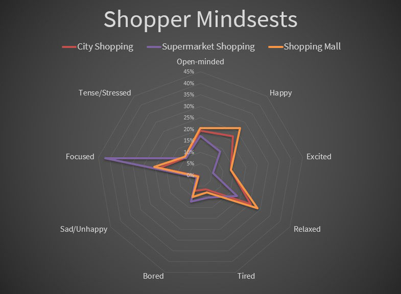 State of mind understanding plays a key role in selecting effective creative communications within specific environments. Our OCS study of Irish adults shows an actionable contrast between how shoppers feel whether they be on the main street, supermarket or shopping mall. There is more correlation between the state of mind of shoppers on the high street or shopping mall – they tend to be more open-minded, happy and relaxed. They are more likely to be ‘leisure’ shopping. In contrast when visiting the supermarket shoppers tend to be more focused, tired and bored. Wherever they are shoppers are looking for prompts and inspiration. These insights can feed into more effective messaging tapping into the consumer’s psyche.