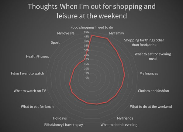 Our OCS study extends into exploring the thoughts when people are out for shopping and retail at the weekend. A range of Fs dominate the mindset – family, food, finances, fashion, friends, films and fitness. People are more alert and motivated when out of home. They are thinking socially and exhibit a range of need states.