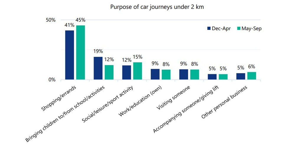 The recently released Behavioural Energy and Travel Tracker from the SEAI shows that over two periods last year shopping or errands was the most common purpose of short car journeys under 2km.