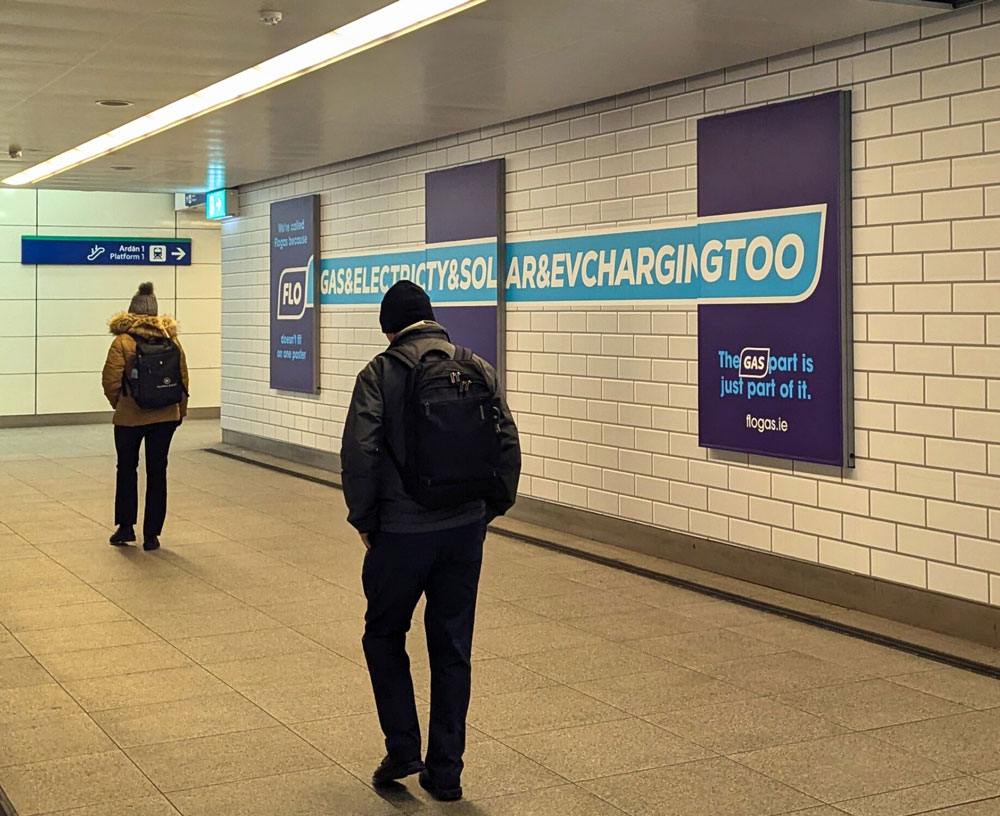 A standout feature of the campaign is a special installation at Pearse Station’s underpass. This creative execution features the Flogas logo extending beyond its traditional frame, evolving into “flogas&Electricity&Solar&EVChargingToo.” The design spans multiple panels, engaging commuters with its visual appeal and reinforcing the brand’s extensive services.