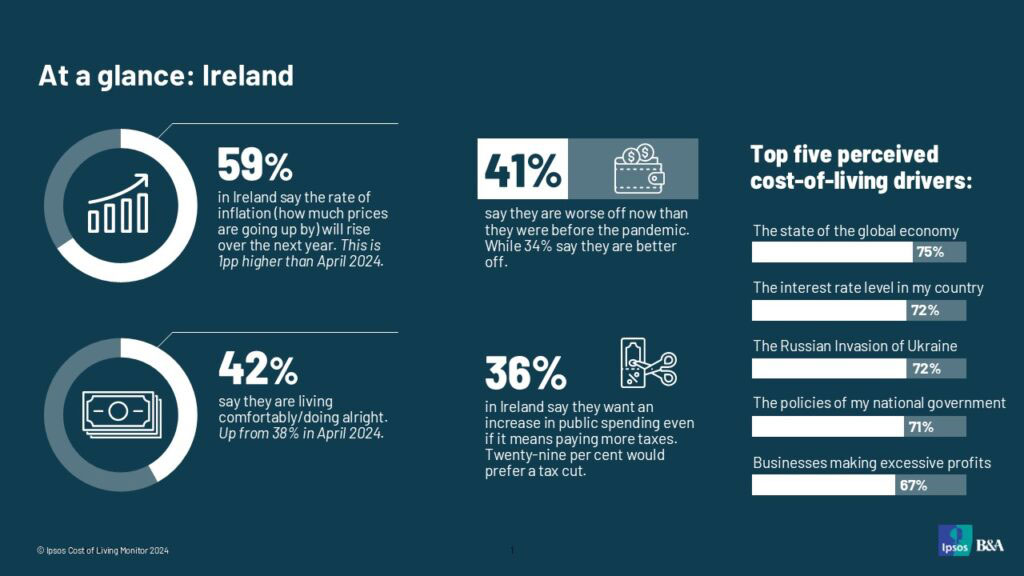 From an Irish perspective, Paul Moran, associate director at Ipsos B&A notes: “This study reveals a mixed picture of the Irish public’s financial well-being. While a significant portion (41%) feel worse off financially since the pandemic, a similar number (42%) report living comfortably. This contrast indicates an uneven impact of recent economic shifts. Looking ahead, there’s a widespread expectation of rising inflation, with global factors perceived as the primary drivers of cost-of-living increases. Perhaps most significantly as government formation gets underway in the coming days, over a third of adults express a willingness to pay higher taxes to support increased public spending.”