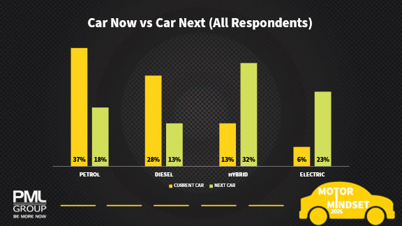 The research is indicative of continued momentum toward electric and hybrid vehicles. In 2023 50% of respondents indicated an intention to purchase an EV or hybrid as their next vehicle, reflecting a sustained focus on sustainability. By 2025 this trend has become even more pronounced. EV ownership doubled from 3% in 2023 to 6% in 2025, while next car preferences for EVs surged from 19% to 23%. Similarly hybrid vehicle preferences grew significantly, with 32% of respondents planning to purchase one as their next car compared to 31% in 2023.