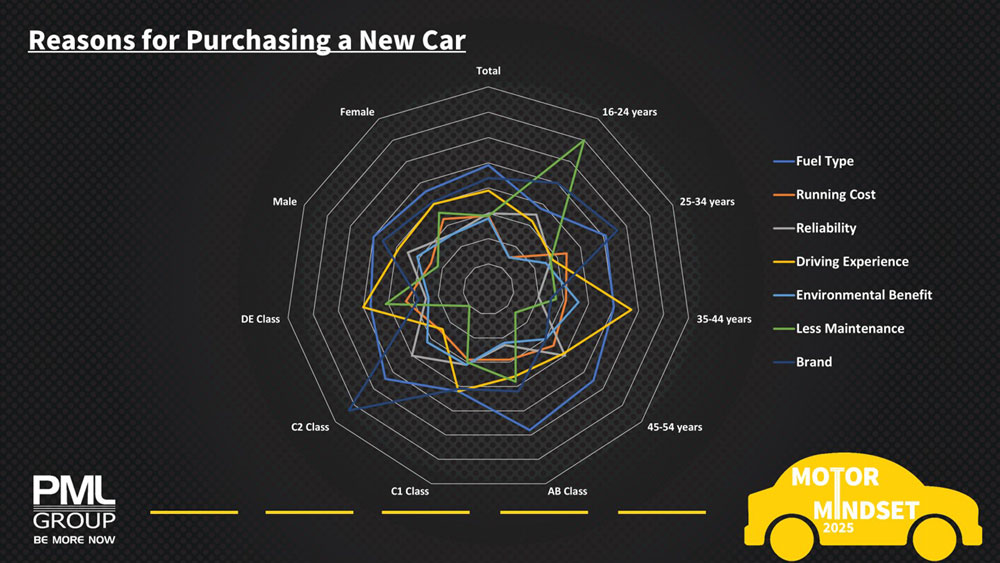 Interestingly low maintenance emerges as a significant factor for the youngest cohort with 70% of 16-24-year-olds ranking it among their top three reasons. In contrast, older buyers aged 45-54 are more likely to prioritise reliability for a more long-term solution.
