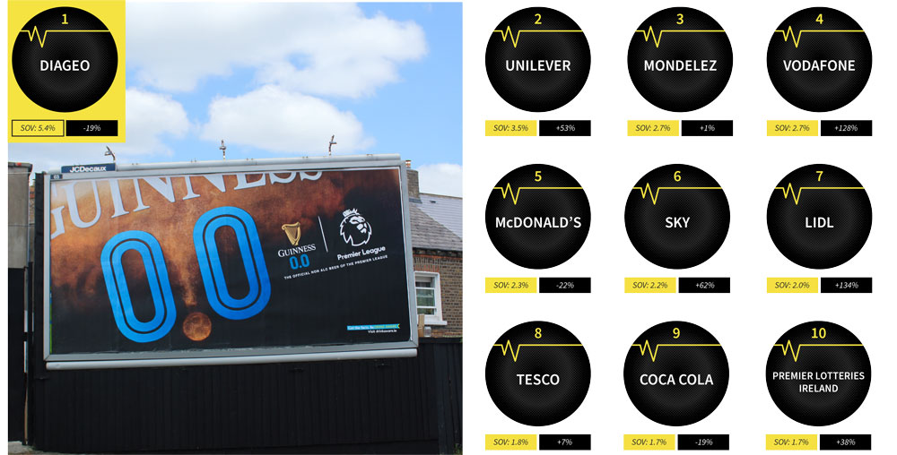 At an advertiser level, Diageo’s investment on OOH through brands including Guinness, Carlsberg and Baileys maintained its position as the country’s top advertiser on the medium. Guinness and Guinness 0.0’s new association with the Premier League was vividly brought to life via classic and digital OOH, while Baileys’ scented special and Smirnoff’s UV mural were other highlights from the drinks company.