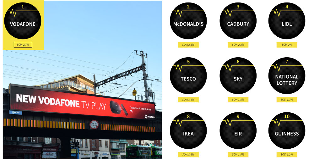 Vodafone ended 2024 as the biggest spending brand on OOH media, according to WATCH, PML Group’s market intelligence resource. During the past twelve months the Telecoms brand has more than doubled its investment in the channel and accounted for almost 3% of all OOH display value. Its campaign activity included promoting the launch of Vodafone TV Play, leveraging its Irish rugby sponsorship around the Six Nations and localised messaging that communicated its broadband offering by county.