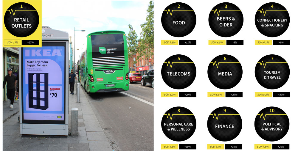Retail was by far the largest spending category on OOH in 2024. All of Ireland’s major supermarket brands were among the top 30 advertisers for the year with Tesco and Lidl among the top 10 and Musgrave Group joining them in the top 20. More than one in every seven euro of display value on the medium in 2024 was placed by a retailer. Apart from the supermarkets, the biggest retail brands on OOH last year were IKEA and JD Sports. As a whole, Retail increased its display value by 27%. Other notable category increases were Media (+27%), Tourism/Travel (+37%), Personal Care/Wellness (+39%) and Finance (+31%).