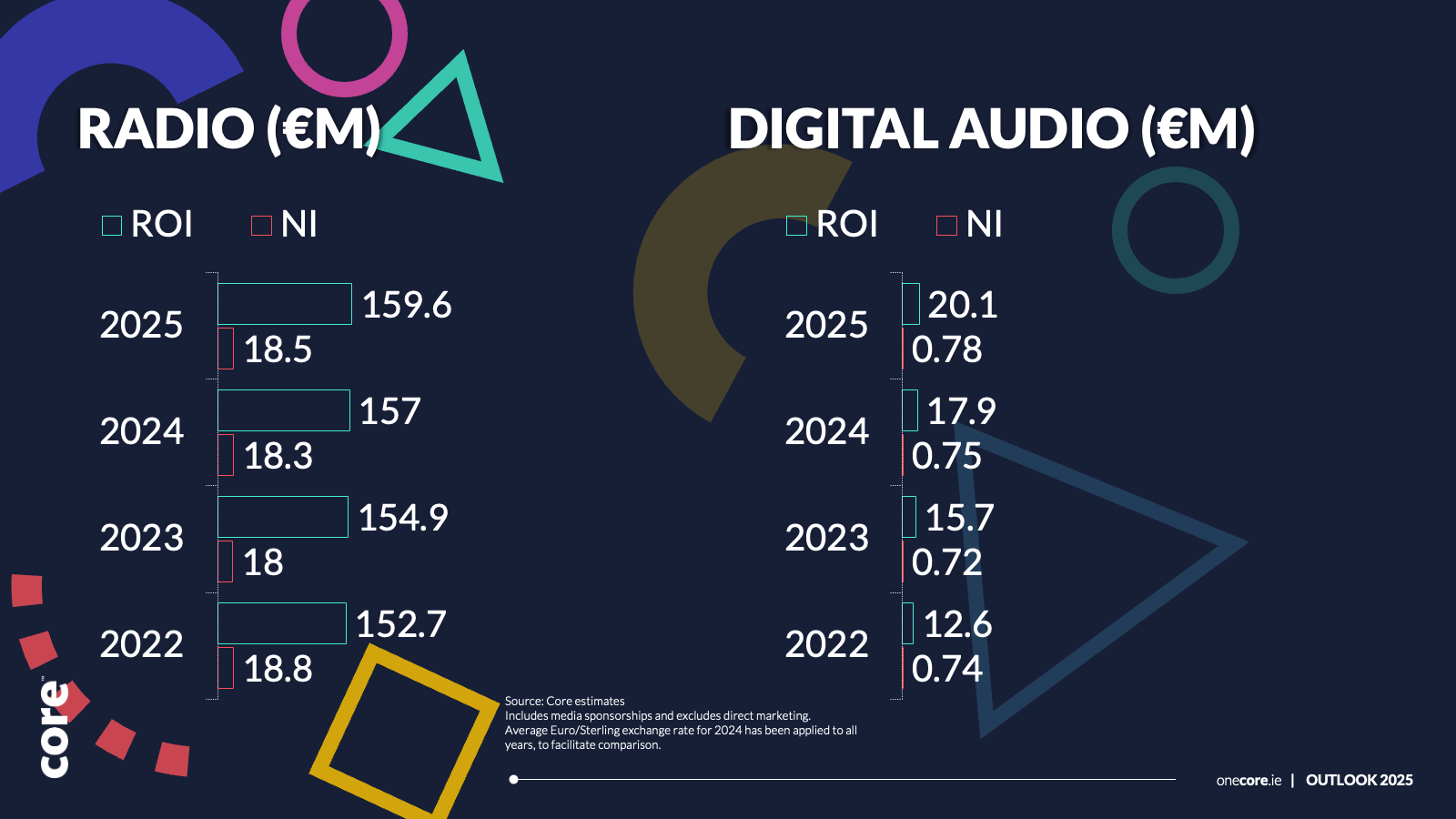 According to Core’s Outlook report, radio advertising revenues are forecast to grow by 1.7% to €159.6m in 2025 while digital audio advertising will continue to grow to €20.1m this year, a 12.3% increase of 2024.