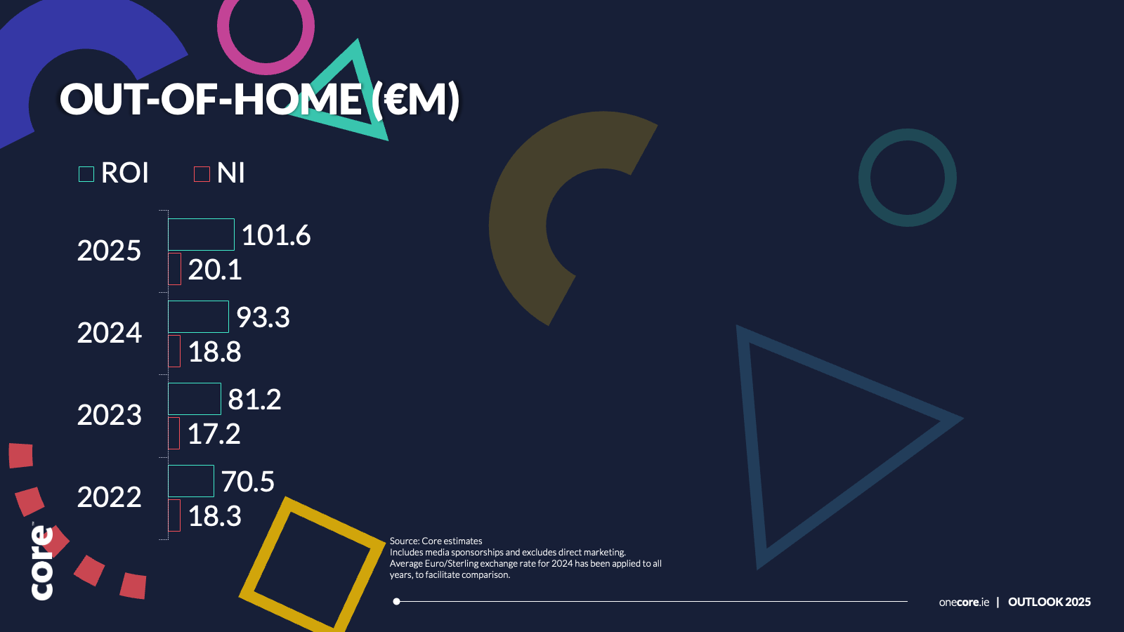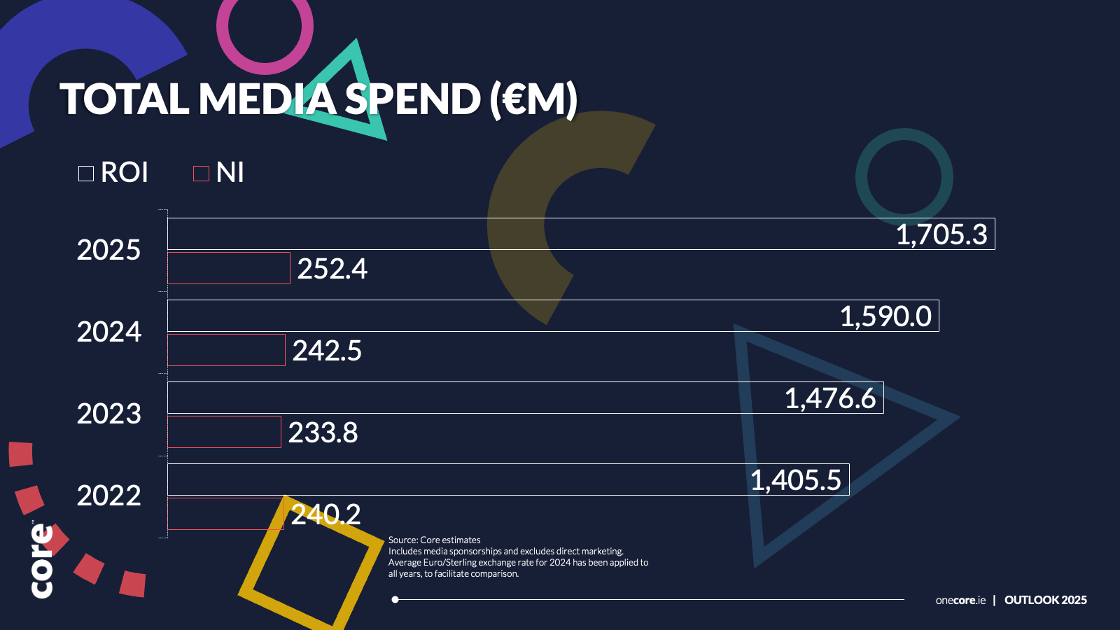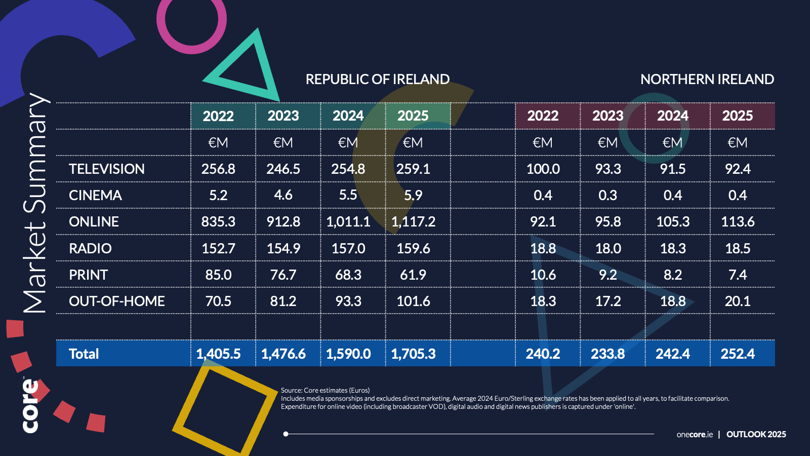 According to Core’s forecasts, increases in digital and out-of-home advertising will power much of the growth in 2025. Core is forecasting that online advertising spend in 2025 will rise to €1.11bn while OOH spend will rise by 8.9% to €101.6m.