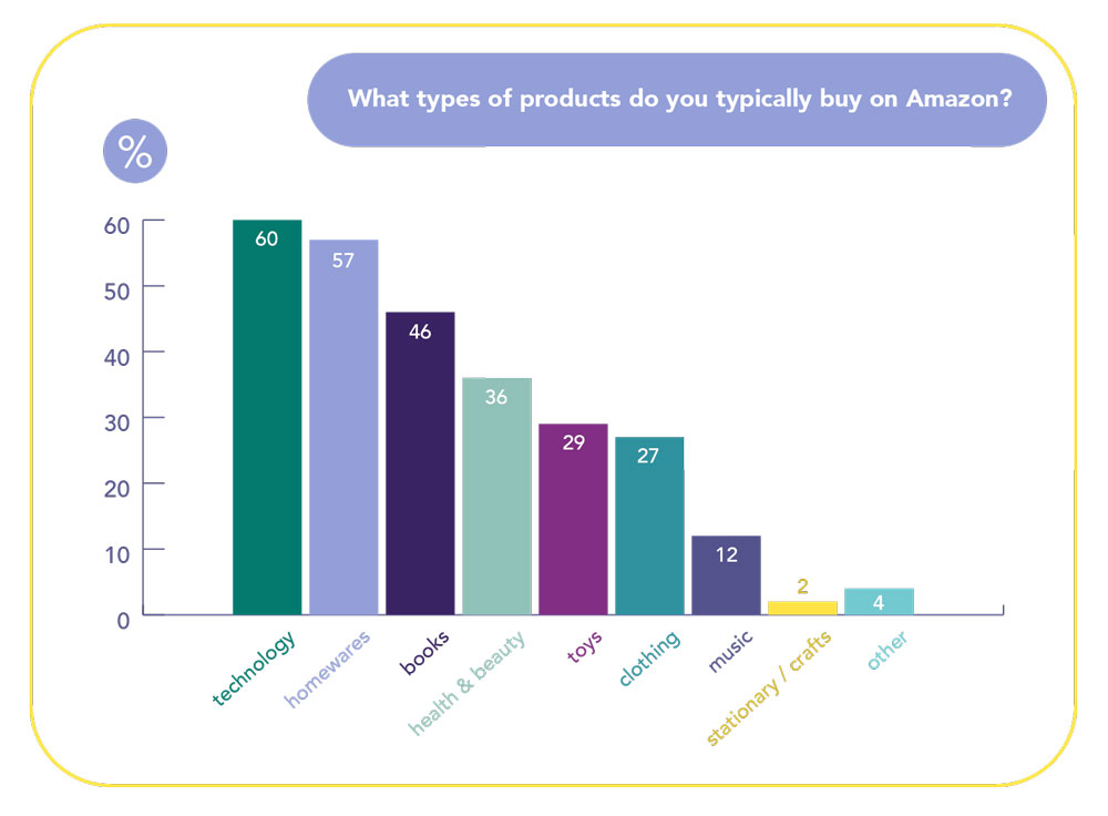 A Broad Shopping Basket: Technology (60%), homewares (57%), and books (46%) are the most popular purchases among Irish Amazon customers.